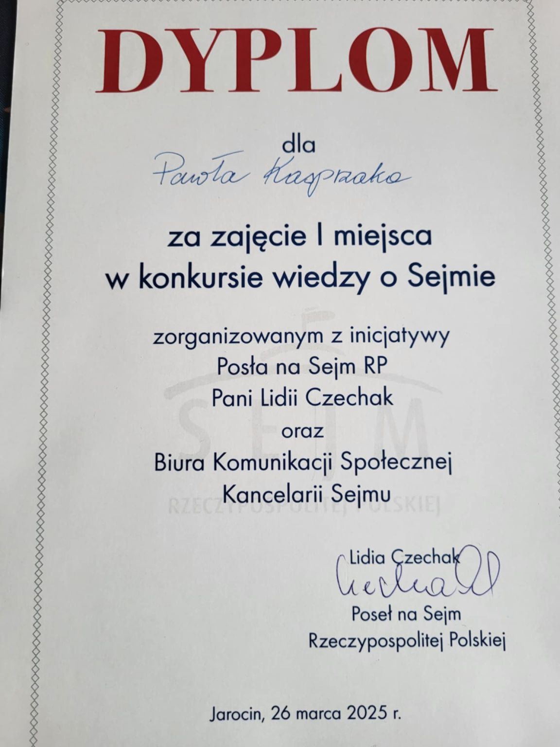 Sukces naszej młodzieży w Konkursie Wiedzy o Sejmie